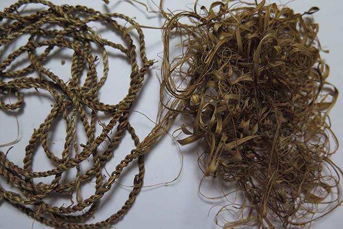 写真は畑で育ったものから取った繊維と縄。
