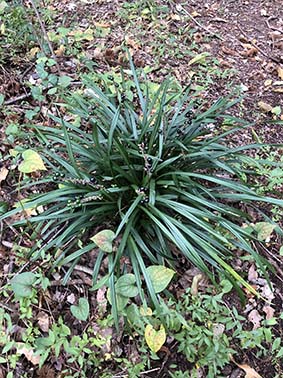 ジャノヒゲ。「春日井の自然と人々のくらし」脇田雅彦、脇田節子著)には子供の遊びにカモジグサの代わりに使うとある。写真はコクリュウと呼ばれる園芸種。