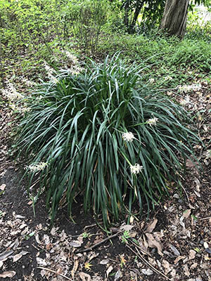 ヤブラン。伝統的な繊維植物としてではないが、葉の繊維で縄をなうことができる。葉をそのまま乾燥して縄にしてもよいが、もっとも丈夫な繊維だけにする方が、強い縄ができる。