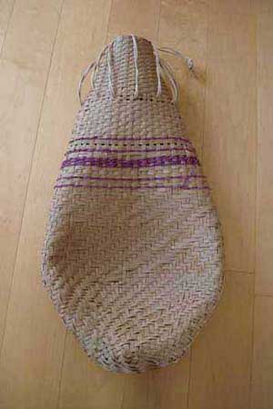 ただし、素材が紙バンドという柔らかい素材であったので、実際の樹木のへぎ材に比べて弾力が少ない。また厚みも違うので、実際に編んだ時にはタテ材の間隔が詰まらなかった。
